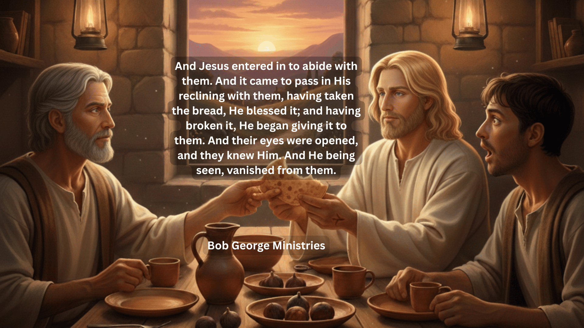 And He entered in to abide with them. And it came to pass in His reclining with them, having taken the bread, He blessed it; and having broken it, He began giving it to them. And their eyes were opened, and they knew Him. And He being seen, vanished from them.
